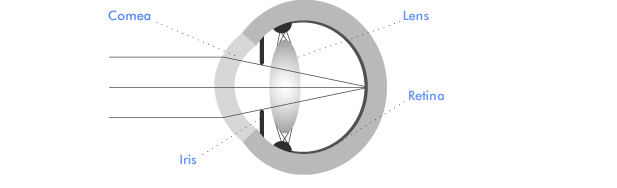 In high myopia (>-8.00D) the eye has too much focussing power. Without glasses, light from objects further than 1/8th of a metre away from the eye is focussed in front of the retina, forming a blurred image.