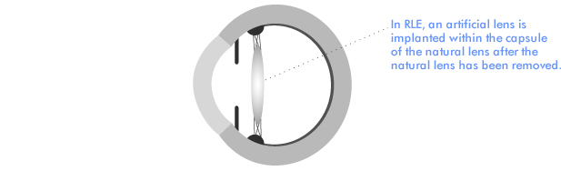 RLE is exactly the same as cataract surgery. But, as the name suggests, the operation involves the removal of a clear natural lens rather than a cataract. An artificial lens is implanted to provide refractive correction. The main advantage of this technique is its familiarity to surgeons - cataract surgery is the commonest operation of any type performed today. Loss of the natural lens means loss of accommodation, or the ability to read without glasses. Accommodation and lens clarity both decline with age. So RLE is often preferred for patients over 50. For younger patients, ICL or ACL implantation are normally preferred, since both techniques preserve natural accommodation and may be less likely than RLE to precipitate a retinal detachment.